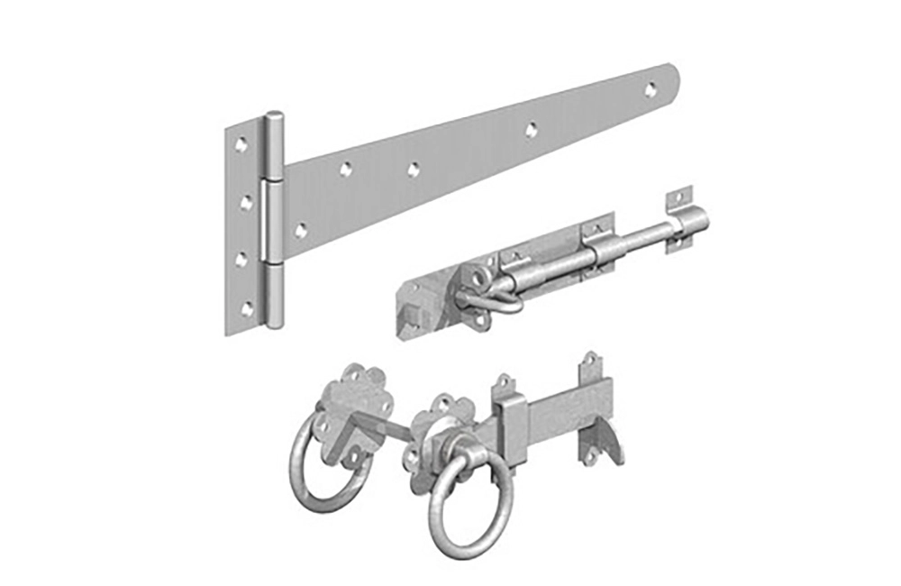 - 1 x pair 16” medium tee hinges, 1 x 6” ring gate latch, 1 x 6” x ½” brenton padbolt and fixings to suit